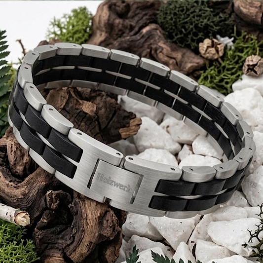 • Holzwerk KALKSEE silber-schwarzes  Holz Armband aus Ebonyholz und Edelstahl mit Gliederkonstruktion Schrägansicht