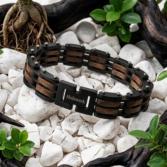 • Holzwerk TREIBSEE schwarz-braunes  Holz Armband aus Walnussholz und Edelstahl mit Gliederkonstruktion Schrägansicht