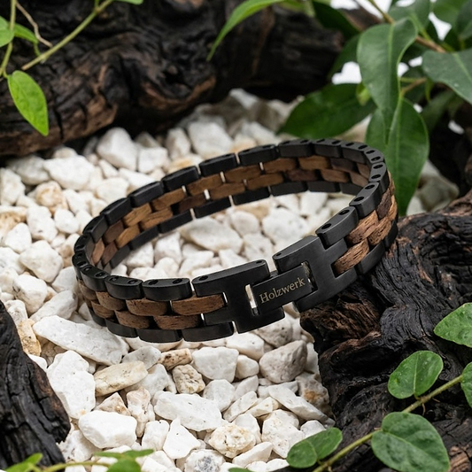 • Holzwerk Tiefsee Armband aus Ebonyholz und Edelstahl in Schwarz und Dunkelbraun mit Gliederdesign und Klappverschluss, Frontal
