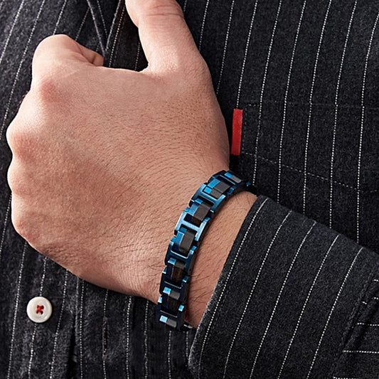 • Holzwerk WEITSEE Armband aus Ebonyholz und Edelstahl in Blau und Dunkelbraun mit Gliederdesign und Klappverschluss, Frontal