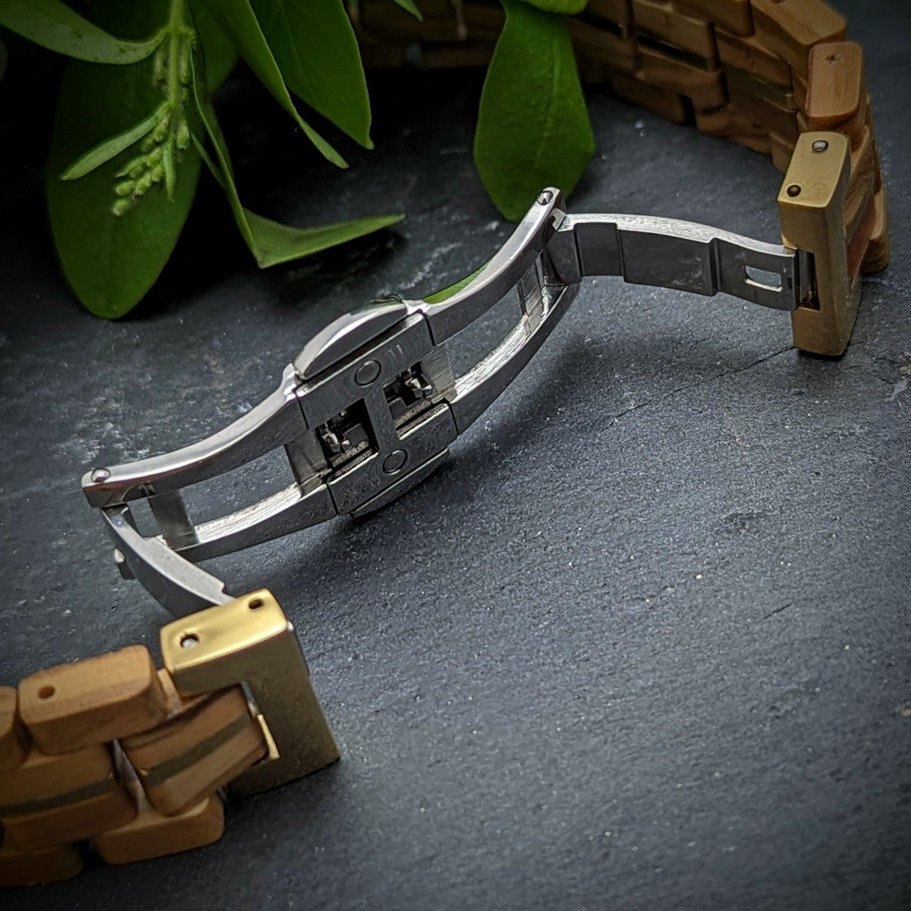 - Bracelet material: wood with stainless steel elements