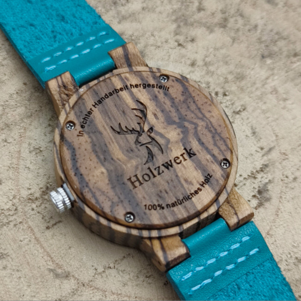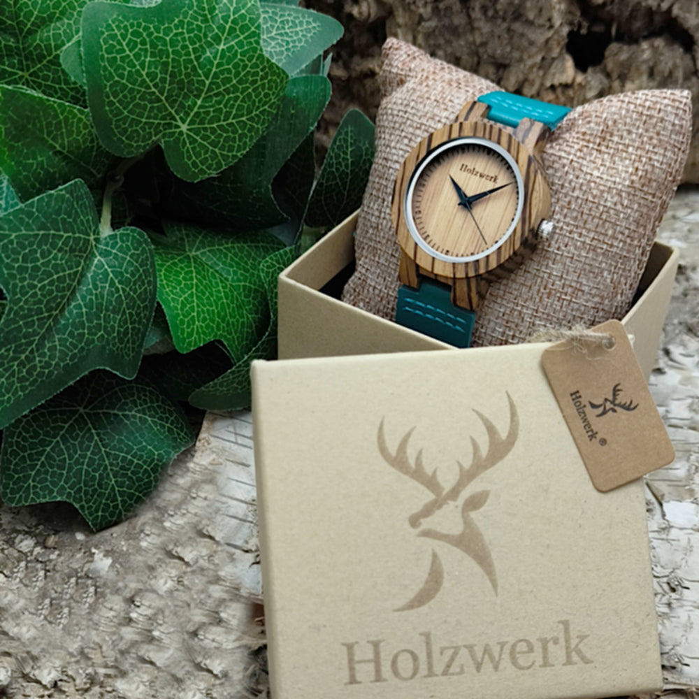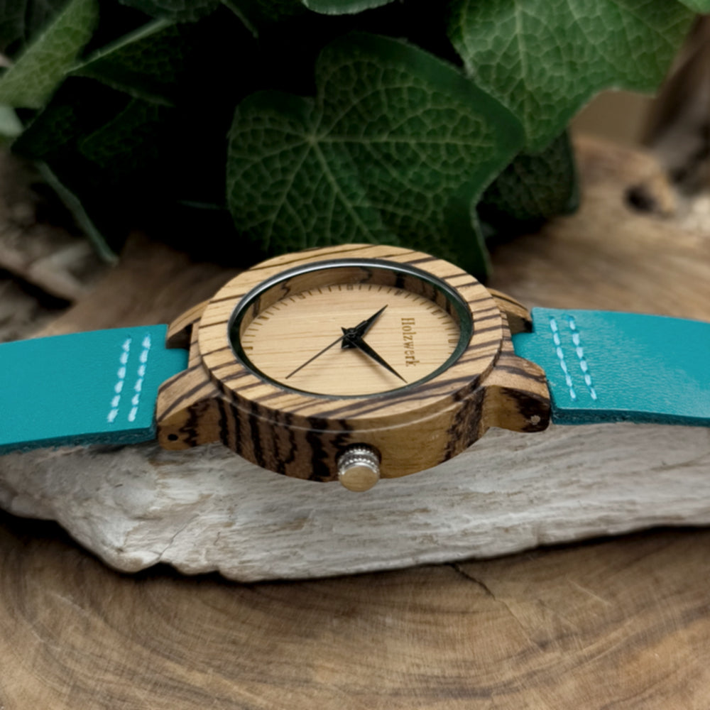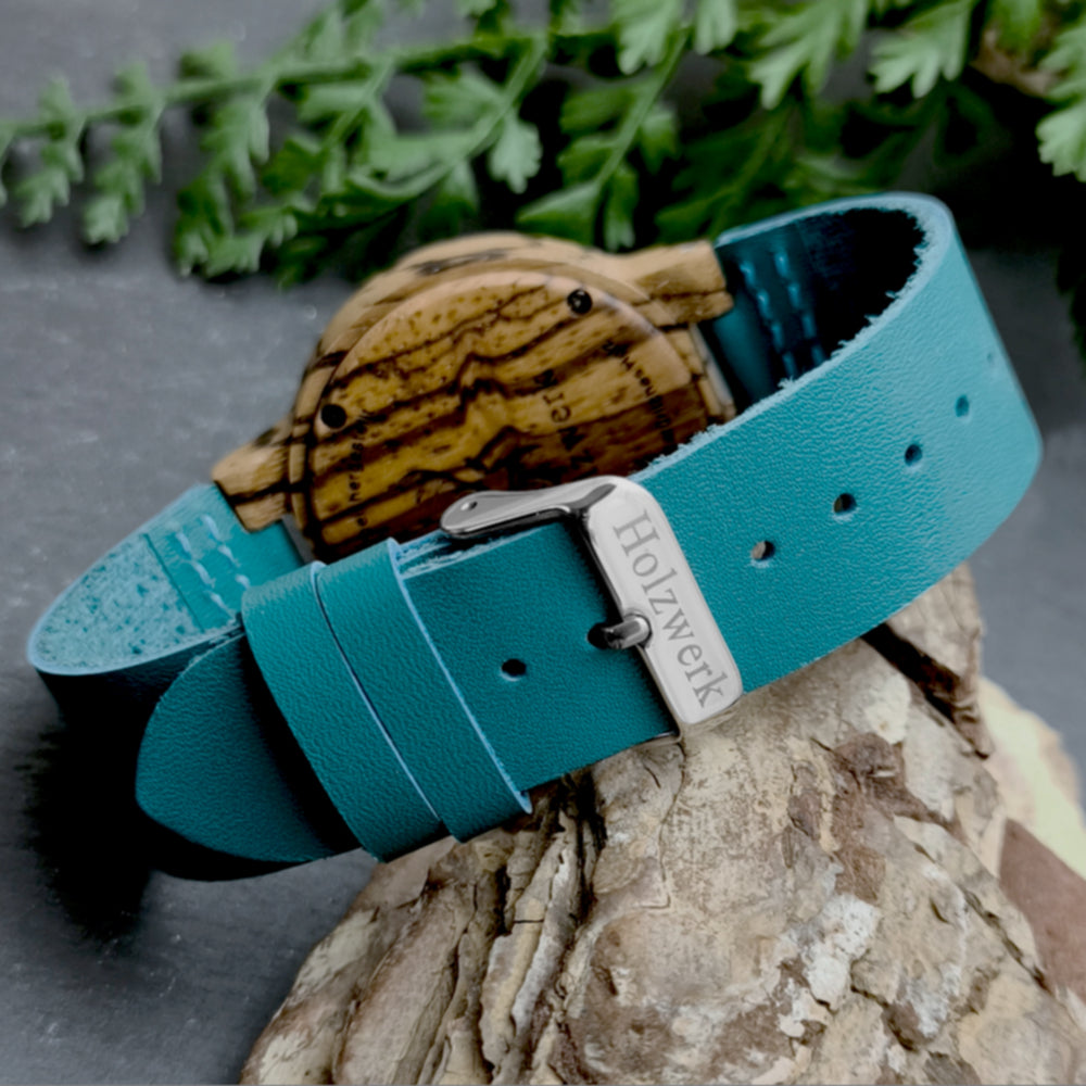 Holzwerk KAHLA women's wooden watch with leather strap, version in turquoise blue & brown Holzwerk LIL NAILA small women's wooden watch with leather strap, brown & turquoise blue variant Holzwerk NAILA women's wooden watch with leather strap, variant in brown & turquoise blue