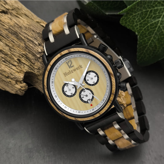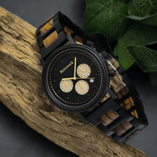 Montre automatique en bois Holzwerk pour homme avec date, noir et rouge
