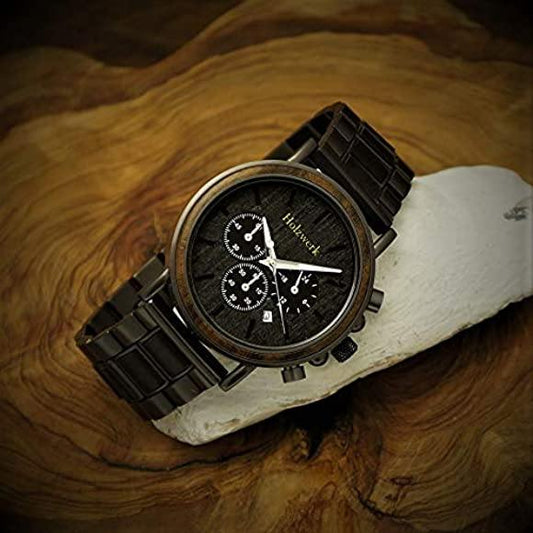 Montre automatique en bois Holzwerk pour homme avec date, noir et rouge